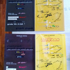 Aeromusiche d’Alfabeto in Libertà, riproduzione dell’originale di Tullio Crali, cm 28×44, 4 tavole recto-verso in cartone cuoio, rivestite in cartoncino, colorate e rilegate a mano da Simone Pasquali.