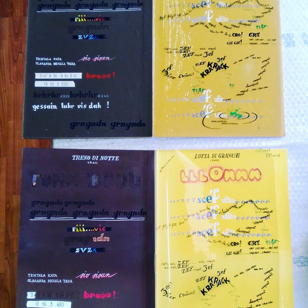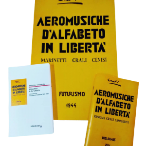 “Aeromusiche d’Alfabeto in Libertà viene confezionato in un volume contenente le tavole parolibere dipinte a pennello e colori a tempera di Marinetti, Crali, e Raoul Cenisi. L’unica copia viene donata a Marinetti, che purtroppo non riuscirà a farla pubblicare in tempo dalle Edizioni ERRE. […] Tra la fine del 1984 e l’inizio del 1985, è da situarsi l’amara scoperta che fece Crali quando si accorse che la copia donata a Marinetti era stranamente finita in mano ad un noto libraio antiquario romano, che subito s’era affrettato a rivenderla al collezionista americano Mitchell Wolfson Jr.. […] Fu così che Crali decise di confezionarne altre due copie virtualmente identiche, una per il proprio Archivio personale, e un’altra poi regalata al terzo artista coinvolto nel progetto, il pittore goriziano Raoul Cenisi. […] Questo libro-oggetto, fu poi esposto per la prima volta nell’ambito della mostra il Futurismo Veneto, svoltasi a Padova nel 1990; e un paio di foto delle tavole del librone in questione, più una immagine dello stesso esemplare esposto in piedi racchiuso in una teca di vetro, abbellirono anche il catalogo della mostra. […] Per realizzare questo spettacolare volume, si è tenuto ovviamente in considerazione l’esemplare personale di Crali, gelosamente custodito dalla Famiglia e generosamente concesso per la riproduzione.”