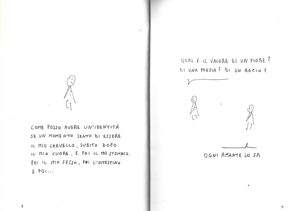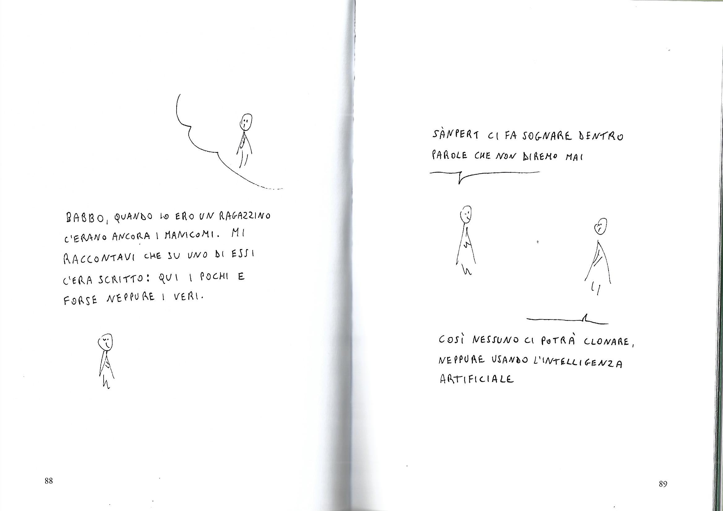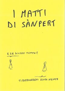 “In principio erano i matti e i matti erano presso dio” e ce lo riportano senza alcun pudore, senza nessun politicamente(?) corretto. I pupazzetti, i “matti” di Sànpert, “prendono forma su fogli scartati dalla stampa dei grandi libri, quelli con una sola vita, forse anche artificiale”. Ma questo libro, sì per me è un libro (sono nato a metà del secolo scorso e so distinguere un libro), ci fa scoprire l’umanità fra le lacrime di un bambino innocente, di un fiore appena spezzato, e ci ricorda che “la solitudine che tu mi hai regalato io la coltivo come un fiore, per questo canto, e canto te”, parole da una canzone (Canzone per te), bellissima, di Sergio Endrigo e i “matti” citano anche le parole di una canzone di Modugno La lontananza e anche le parole di un’aria di Händel “Lascia ch’io pianga” dall’opera Rinaldo, queste, e altre citazioni “per far muovere i nostri pensieri sul pentagramma della nostalgia”. Ma i “matti” non ci parlano della nostalgia, ci parlano anche del presente, un invito a leggere quanto ci dicono ne vale la pena, senza pudori e senza essere politicamente(?) corretti.